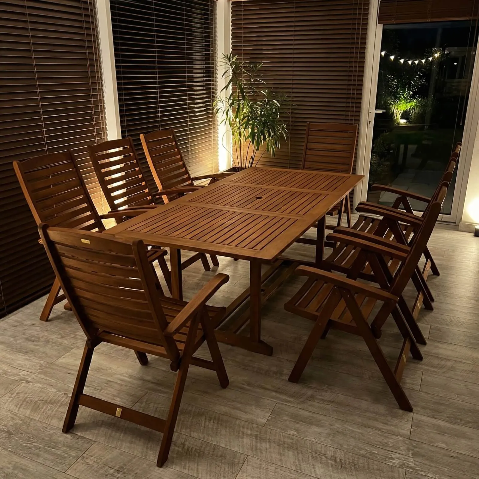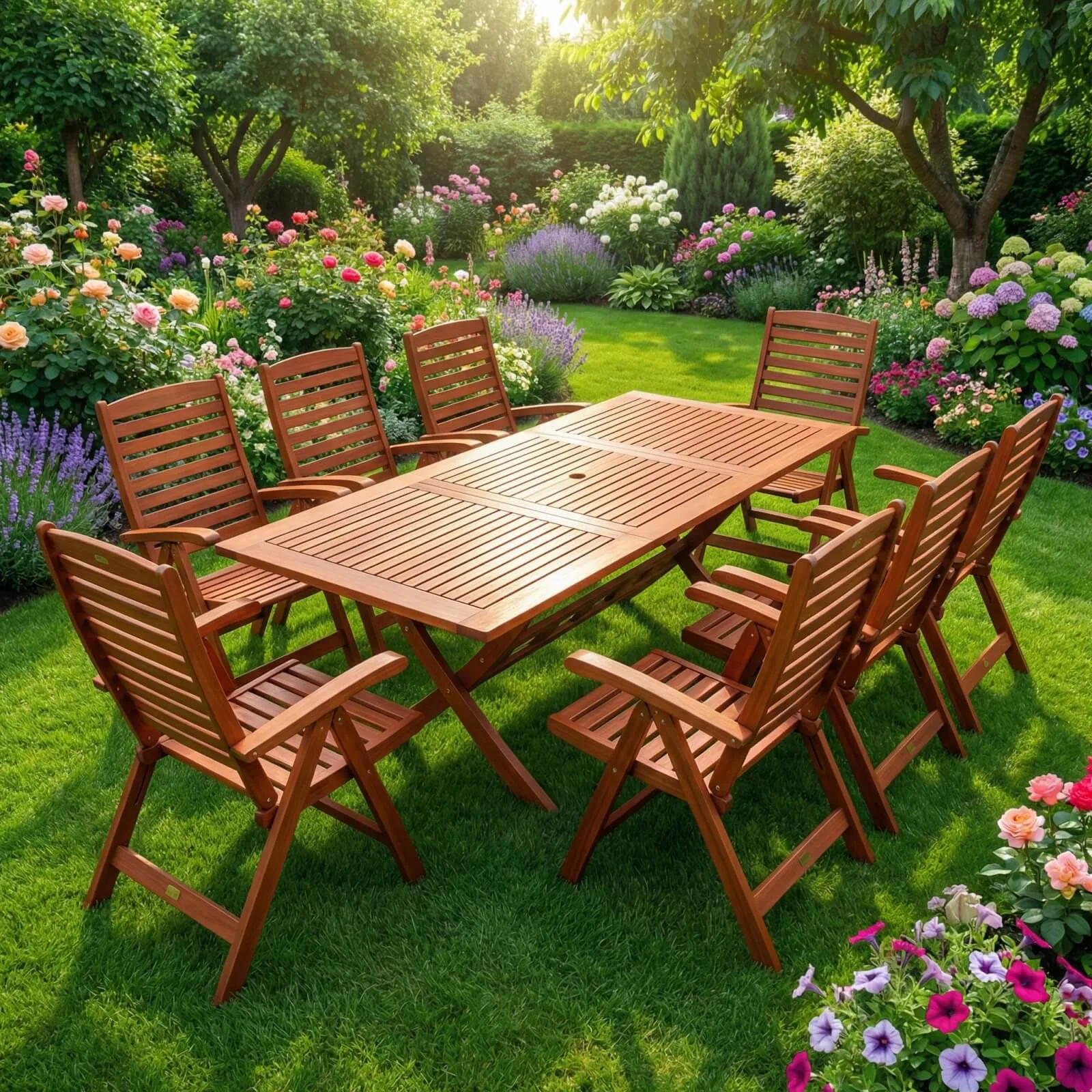 Großes Gartenmöbel Set aus Holz für Familie und Freunde Das Set aus dem großzügigen Bradford Tisch und acht Calgary Stühlen bietet die perfekte Kombination aus Stabilität, Komfort und natürlicher Optik. Es eignet sich hervorragend für große Terrassen und lange Sommerabende im Freien.
