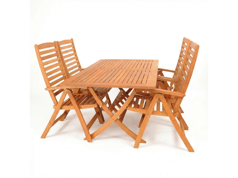 Essgruppe 4 Personen besteht aus Eukalyptusholz. Dank der Beschichtung der Holzoberfläche mit einem Spezialöl, gewinnen die Garten-Möbel eine perfekte, glatte Textur. Der Effekt ist erstaunliche Qualität, Beständigkeit gegen Beschädigung und Schmutz und einfache Pflege.