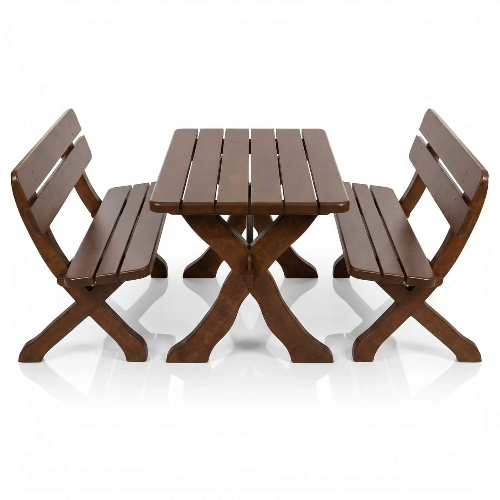 Gartenset Exklusiv kann man auf der Terrasse, auf dem Balkon oder im Garten nutzen. Sie können Ihre Familie und Freunde zu einer Gartenparty einladen und eine wunderbare Zeit haben. Für die Herstellung unserer Möbel verwenden wir sorgfältig ausgewähltes Erlenholz. Das Holz wird vor allem wegen seiner leichten Verarbeitbarkeit und Weichheit geschätzt. Hochbeständiges Erlenholz verwendet man in der Möbelindustrie seit langem, denn Erle hat Eigenschaften, die es sowohl für die Herstellung von Musikinstrumenten als auch von Möbeln geeignet machen. Die Erle wächst in ganz Europa bis nach Sibirien und in Teilen Nordafrikas und Asiens. Unser Gartentisch Bänke Set besteht aus: