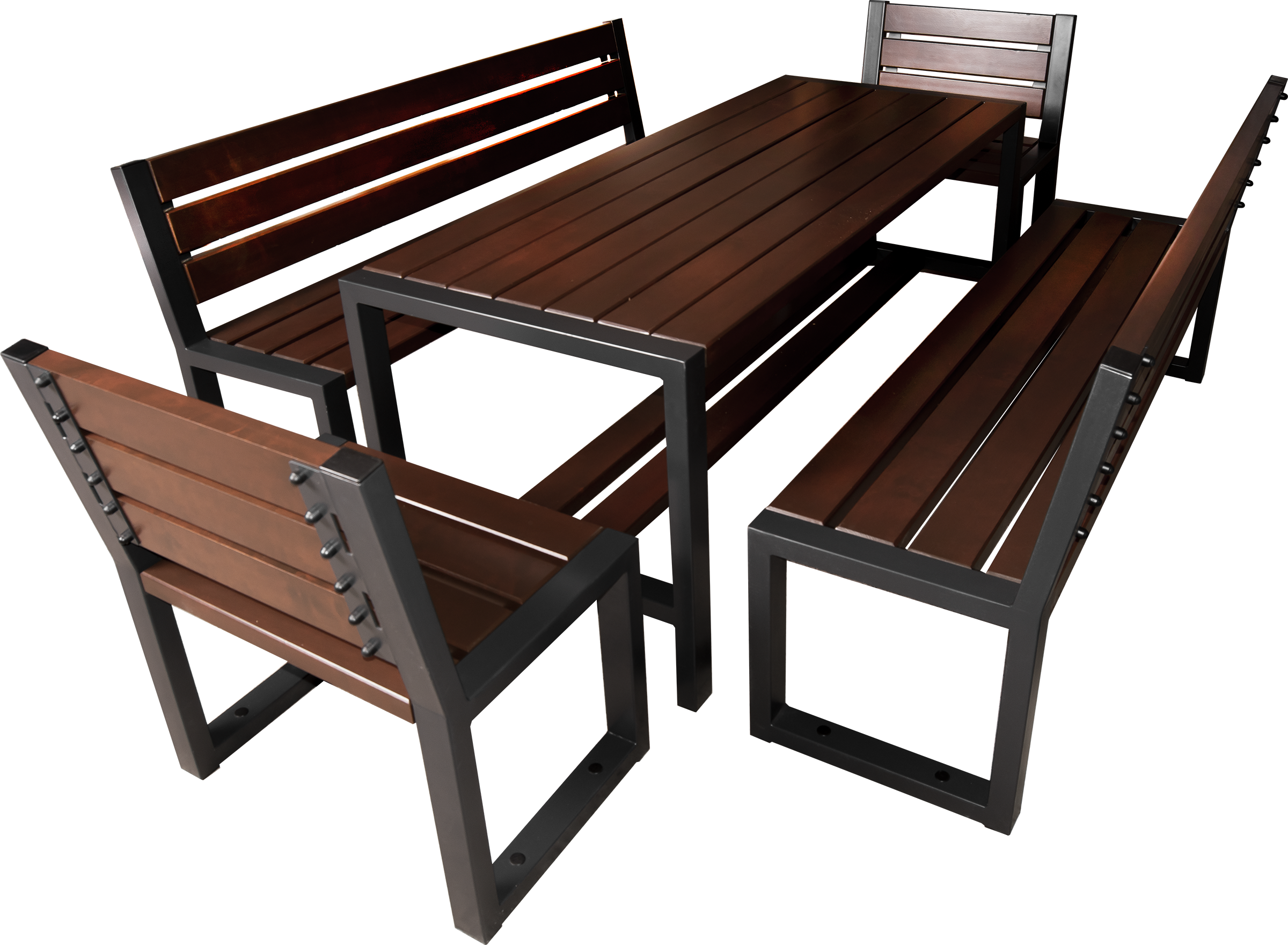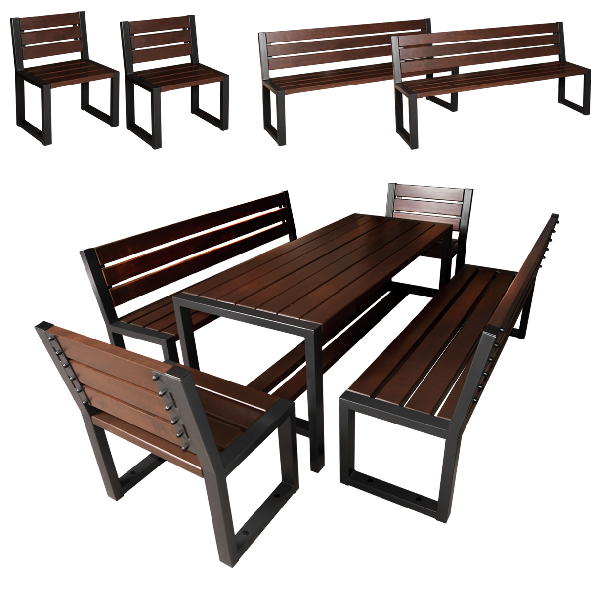 Gartenmöbel Set Holz ohne Armlehne für 8 Personen modern, es besteht aus einem Gartentisch, zwei Gartenbänken und zwei Gartenstühlen mit Rückenlehnen. Langlebige Möbel mit einfachem, klassischem Design, hergestellt aus Stahl und Holzelementen. Dieses moderne Set ermöglicht es Ihnen, einen ästhetischen und komfortablen Ort für Ruhe, Treffen und Entspannung zu schaffen. Die Möbeln sind aus Stahlprofilen 60x40mm und Brettern gefertigt. Die Holzelemente wurden mit Schutzmitteln richtig geschützt. Dadurch behält das Holz sein schönes Aussehen für viele Jahre. Die Stahlprofile sind verzinkt und lackiert. Hier finden Sie Informationen zur Pflege und Bedienungsanleitung
