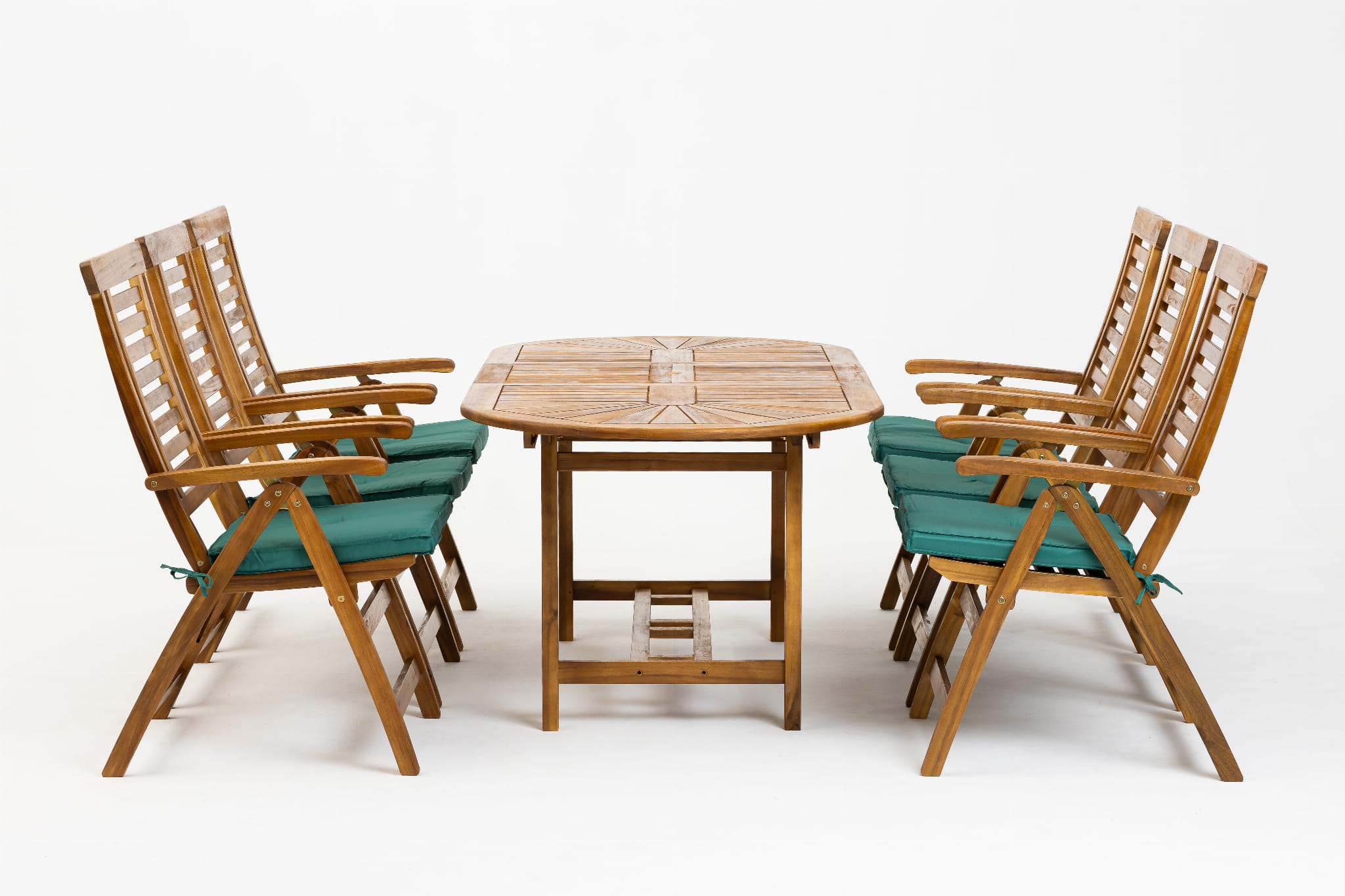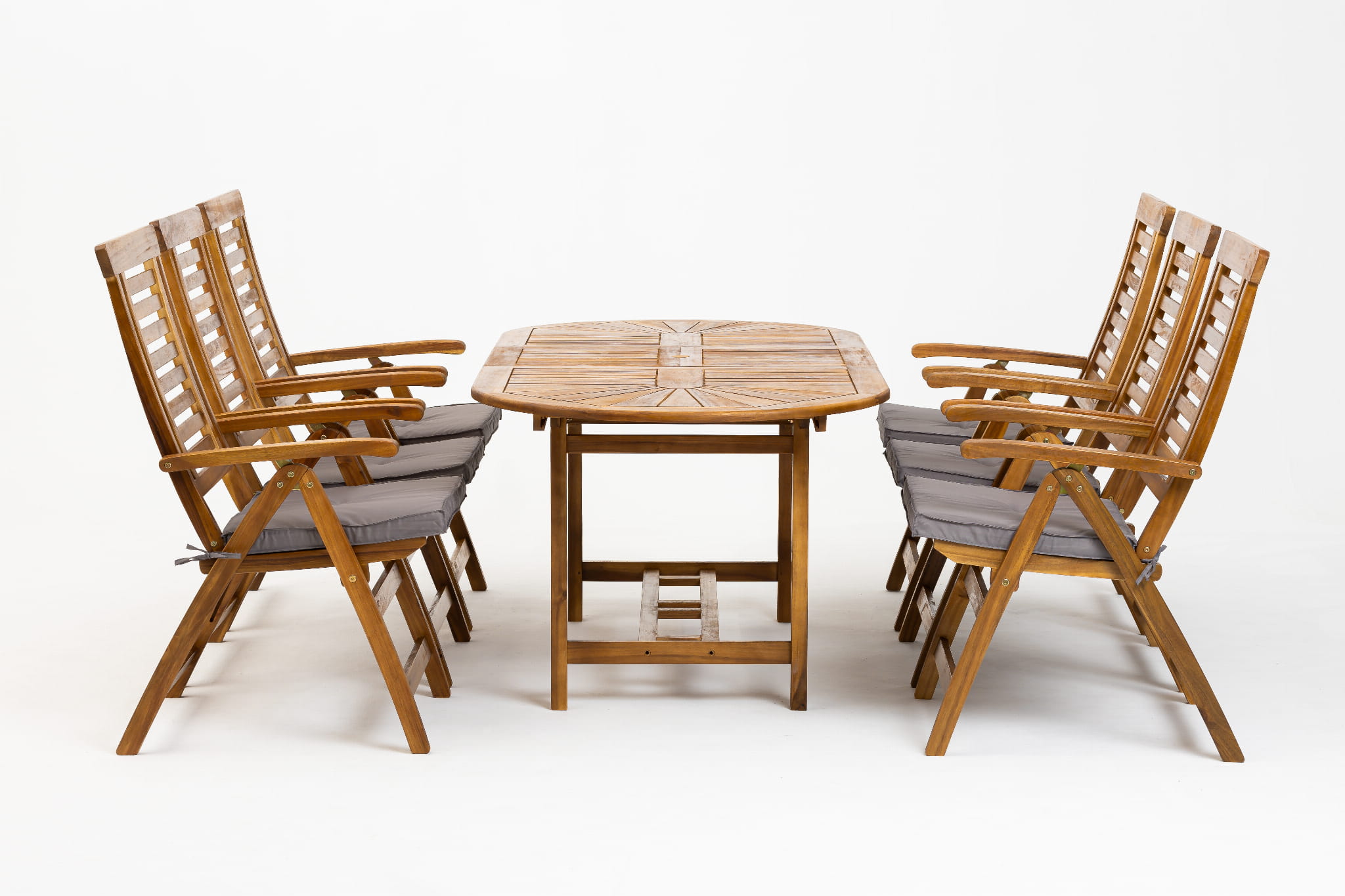 Schmale Akazien-Platten füllen die Oberfläche der Arbeitsplatte sowie der Sitz- und Rückenlehne der Stühle. Für die Konsistenz des Sets sorgt zusätzlich ein warmes angenehmes Dekor in der Farbe Naturholz. Das glatte Finish mit einem subtilen Glanz reflektiert die auf sie einfallenden Sonnenstrahlen wirkungsvoll. Marsylia Gartensets sind ein Vorschlag für Liebhaber klassischer Schönheit. Kissen für Gartenstühle aus hochwertigem Material. Sie sind mit doppelter Naht genäht. Der dezent eingenähte Reißverschluss ermöglicht das Entfernen der Kissenbezüge und das Waschen bei Verschmutzungen.
